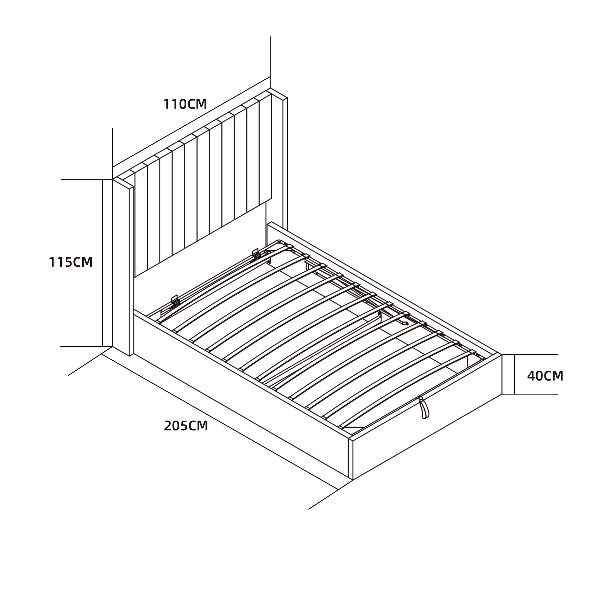 - Coffre de rangement : Le lit est équipé d'un mécanisme de sommier relevable, révélant un espace de rangement en dessous, idéal pour stocker du linge de lit ou d'autres objets.