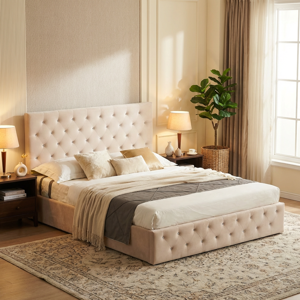Lit coffre capitonné velours beige 140x190 cm sommier inclus VICTORIA