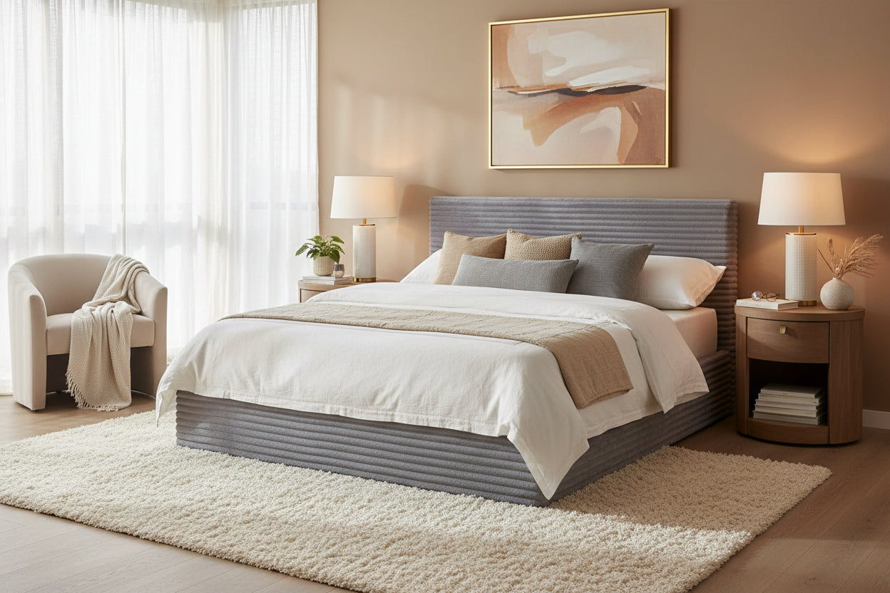 Particularité: Tête de lit imposante avec finitions côtelées verticales apportant du relief et de la profondeur, coffre de rangement spacieux accessible par soulèvement du sommier grâce à un système de vérins hydrauliques sécurisés, et cadre robuste garantissant stabilité et durabilité. Le design côtelé offre une esthétique architecturale unique qui habille la chambre avec élégance.