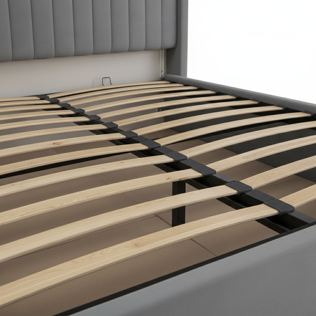 - Coffre de rangement : Le lit est équipé d'un mécanisme de sommier relevable, révélant un espace de rangement en dessous, idéal pour stocker du linge de lit ou d'autres objets.