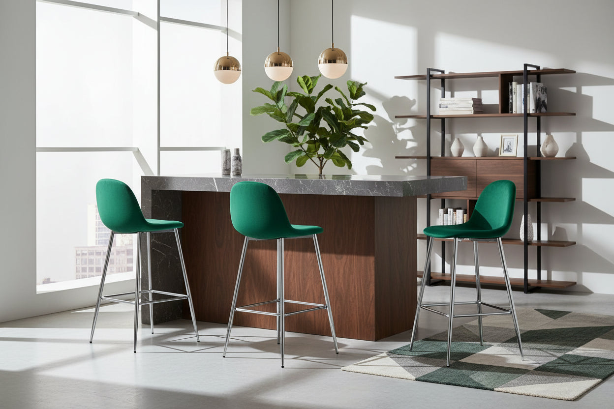 Apportez modernité et confort à votre intérieur avec le lot de 2 tabourets de bar SCANDINAVE en velours vert et piètement chrome. Leur design épuré et leurs lignes sobres s’intègrent facilement dans une cuisine contemporaine, un espace bar ou autour d’un îlot central. Pensés pour un usage quotidien, ils offrent un soutien agréable grâce à leur dossier ergonomique, une assise généreuse et un repose-pieds intégré qui soulage les jambes. Le revêtement en velours vert apporte une note nature chic et du caractère, tout en restant doux et résistant. Les pieds en métal finition chrome ajoutent une note lumineuse et contemporaine, tout en garantissant stabilité et durabilité. Entretien simple au chiffon doux pour conserver un rendu impeccable.