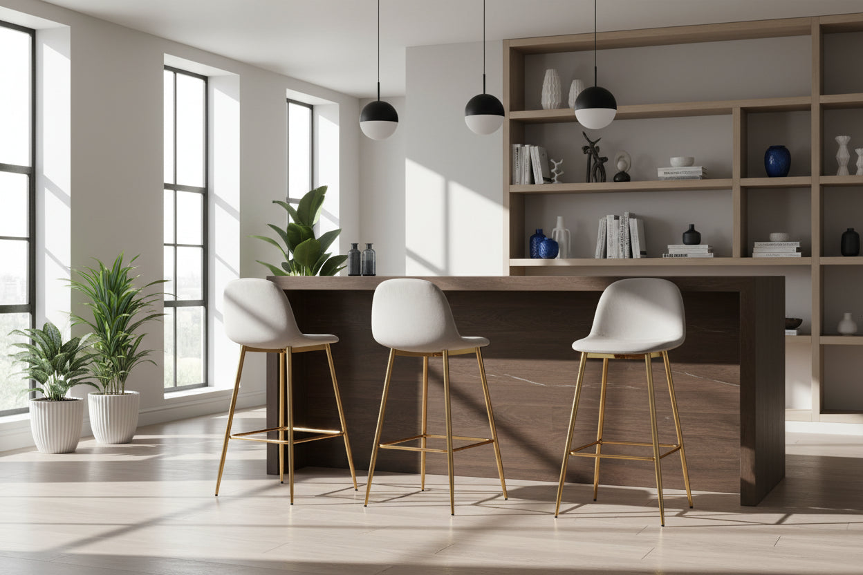 Sublimez votre intérieur avec le lot de 2 tabourets de bar SCANDINAVE en velours taupe et pieds finition Gold, conçu pour allier design épuré, confort et élégance. Leur silhouette scandinave moderne s’intègre facilement dans une cuisine contemporaine, un coin bar ou autour d’un îlot central. Le piétement en métal doré apporte une touche luxueuse et tendance, tout en garantissant une excellente stabilité au quotidien. L’assise en velours doux offre un confort agréable pour une utilisation prolongée, renforcée par un dossier de 31 cm qui apporte un bon soutien. Avec une hauteur d’assise de 71 cm, ces tabourets sont parfaitement adaptés aux bars, comptoirs et plans de travail. Le coloris taupe apporte une note chaleureuse et intemporelle, facile à associer, pour une ambiance cosy et raffinée. Le velours est également simple à entretenir, pour préserver l’aspect du tabouret dans le temps.