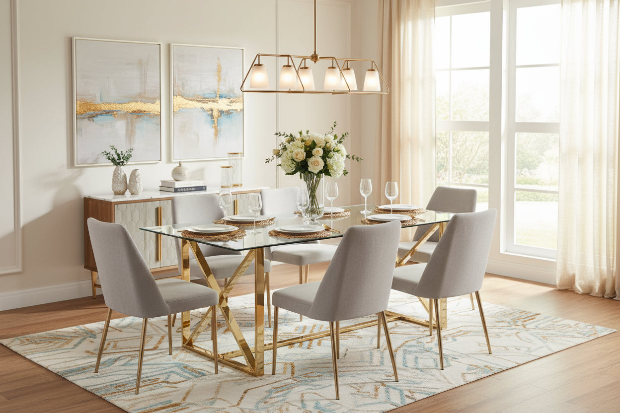 La table KENSY doré se distingue par son plateau en verre trempé lumineux et résistant, associé à un piètement doré au style affirmé. Son format généreux accueille aisément 6 à 8 convives, faisant de cette table un élément central où esthétique, solidité et praticité se rencontrent pour sublimer votre intérieur.
