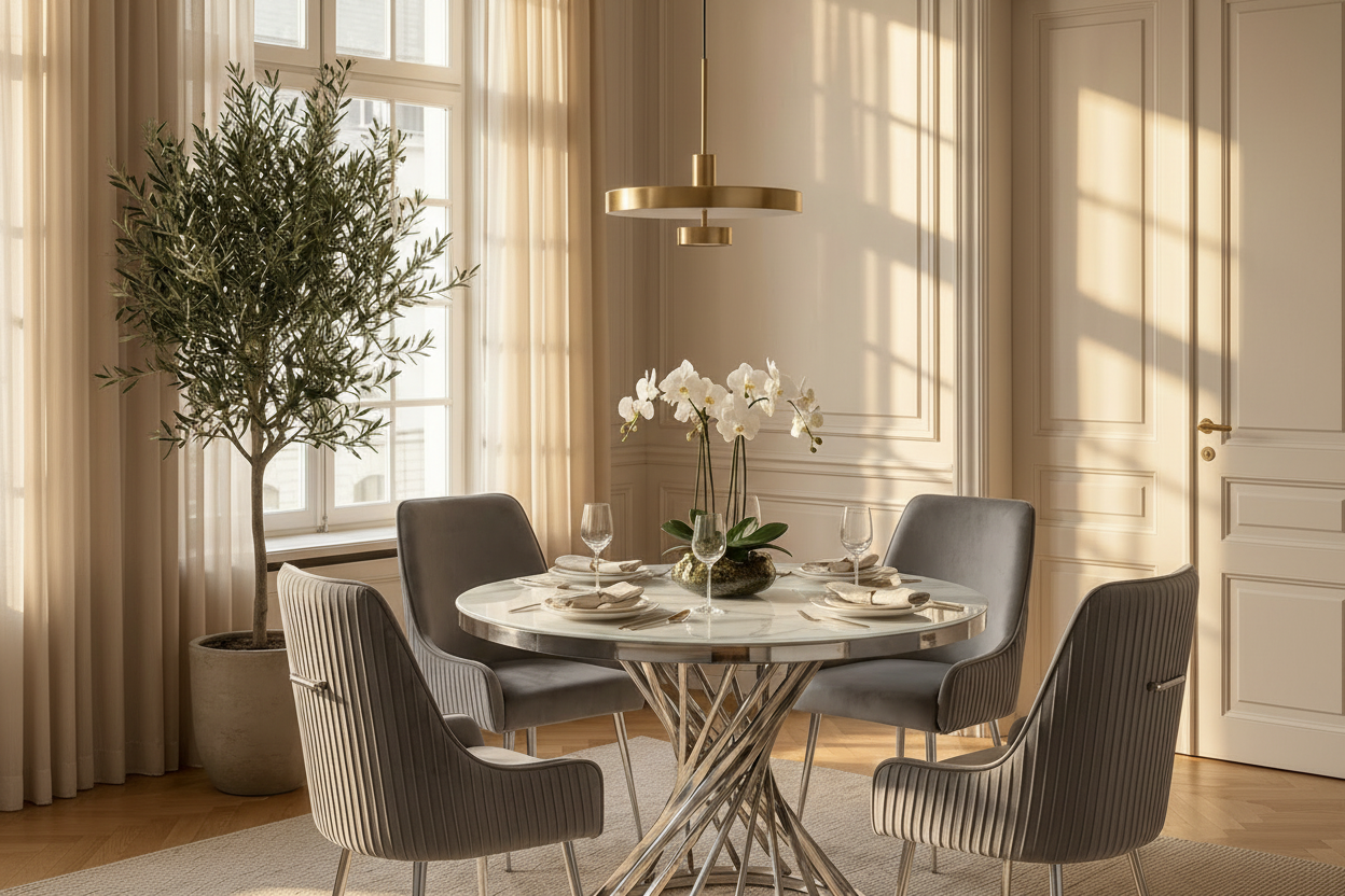 La table à manger ronde en verre trempé effet marbre blanc Chrome combine design contemporain et élégance raffinée. Son plateau en verre trempé imitation marbre blanc apporte luminosité et style tout en garantissant résistance et durabilité. La base en acier inoxydable, composée de tiges entrelacées, crée un motif sculptural et assure une stabilité optimale. Idéale pour les repas conviviaux, cette table transforme votre salle à manger en un espace moderne et accueillant, tout en devenant un élément décoratif central.