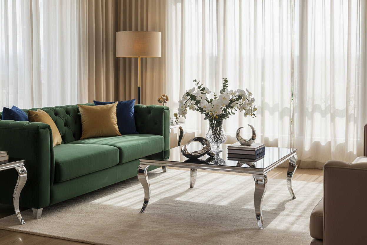 Cette table basse carrée en chrome et verre noir structure élégamment votre salon. Son plateau en verre trempé offre une surface résistante et simple à entretenir, idéale pour accueillir télécommandes, livres ou plateaux lors de moments conviviaux. Le piètement croisé en métal finition chrome assure stabilité et maintien au quotidien. Avec son format 100x100 cm, elle convient aussi bien aux grands espaces qu’aux salons plus structurés. Une solution fonctionnelle pour créer un point central harmonieux et durable dans votre pièce de vie.