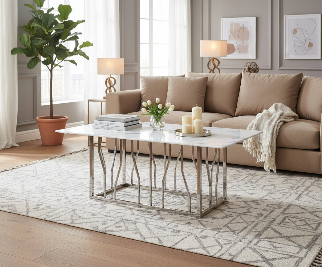 Embellissez votre salon avec la Table Basse PORTOFINO, une fusion parfaite entre luxe et design moderne. Son plateau en verre effet marbré blanc se marie harmonieusement avec des pieds raffinés disponibles en finitions Gold et Chrome, apportant une élégance intemporelle à votre intérieur.