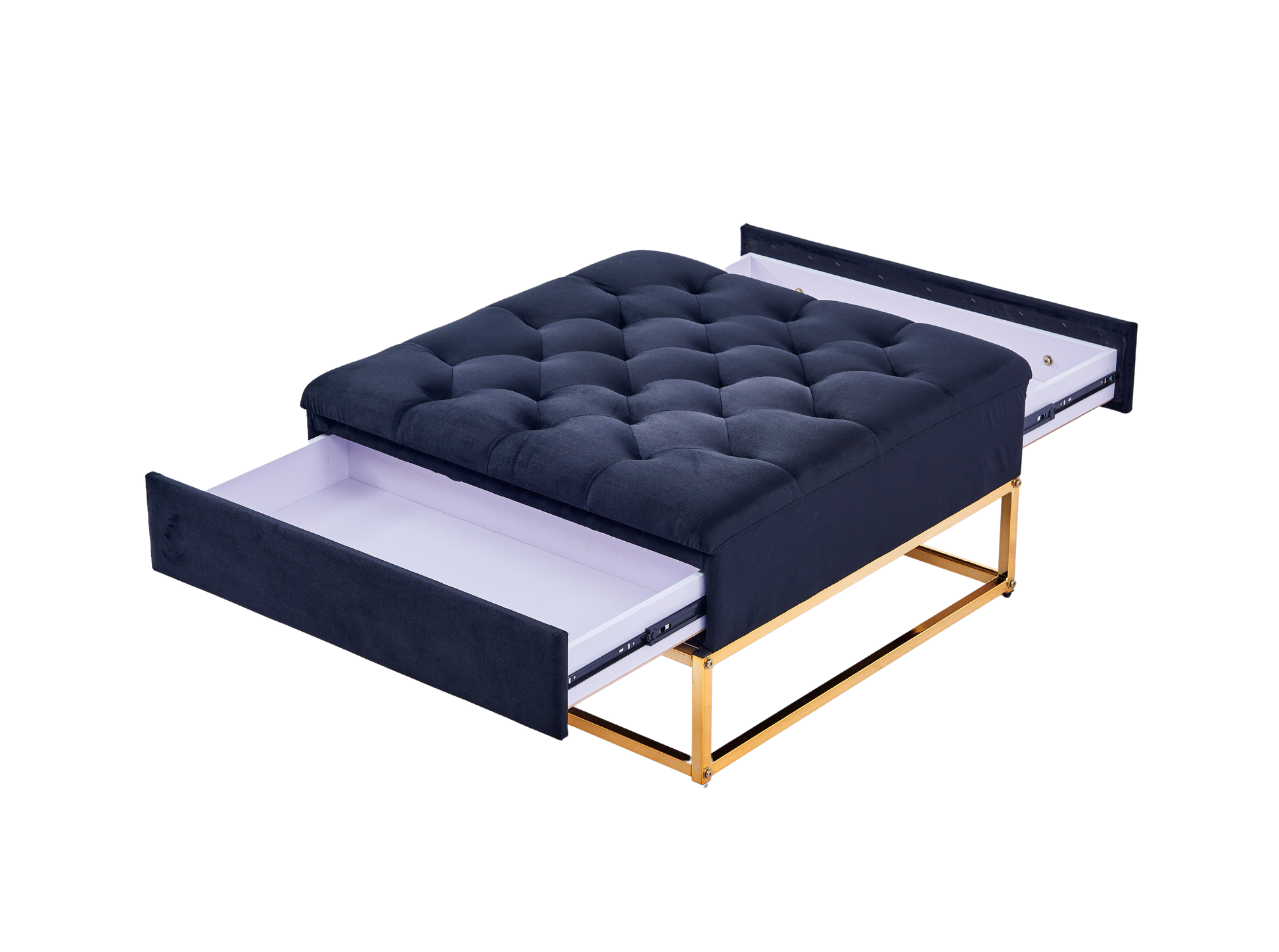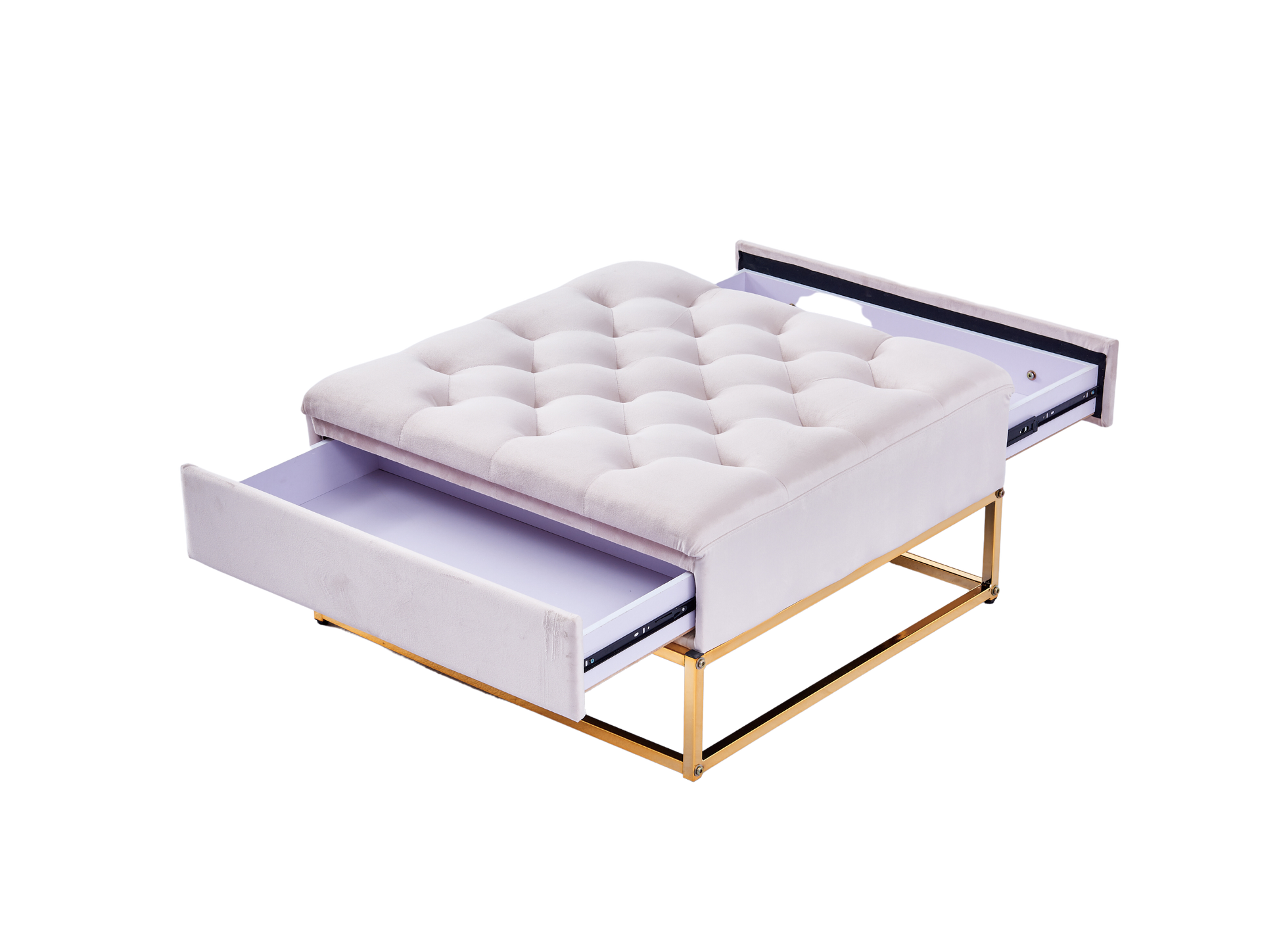 la table basse TIROIR carrée avec un plateau capitonnée en velours et une structure en Inox de couleur Gold met en avant une esthétique haut de gamme, chic et fonctionnel.