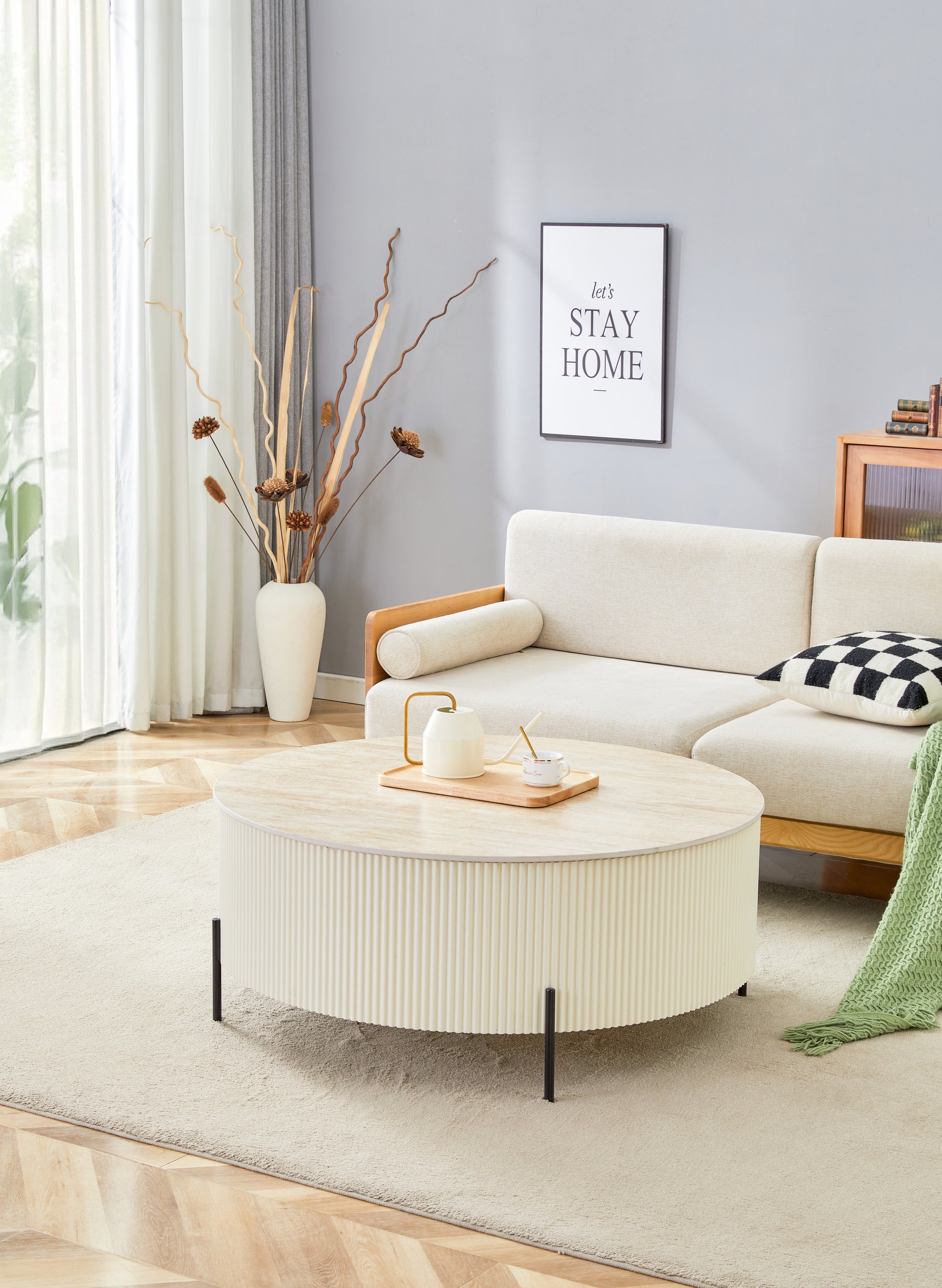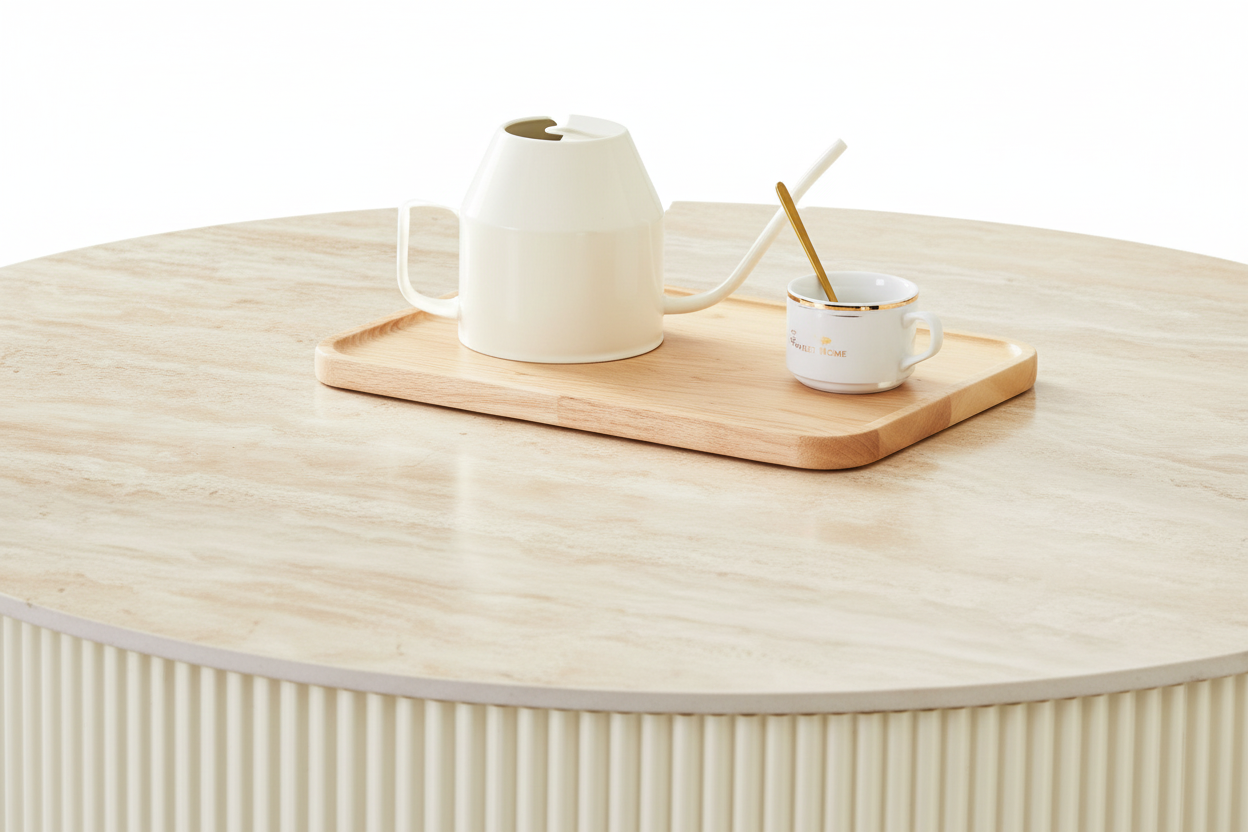Avec son diamètre 100 cm, RUBY devient une véritable pièce maîtresse : idéale pour accompagner un grand canapé, recevoir, poser vos objets déco, livres et plateaux apéritifs. La céramique est un choix parfait au quotidien : facile à nettoyer au chiffon doux, elle conserve son aspect haut de gamme dans le temps. Si vous recherchez une table basse ronde Ø100 effet travertin beige au style minéral et moderne, RUBY réunit esthétique, fonctionnalité et présence.