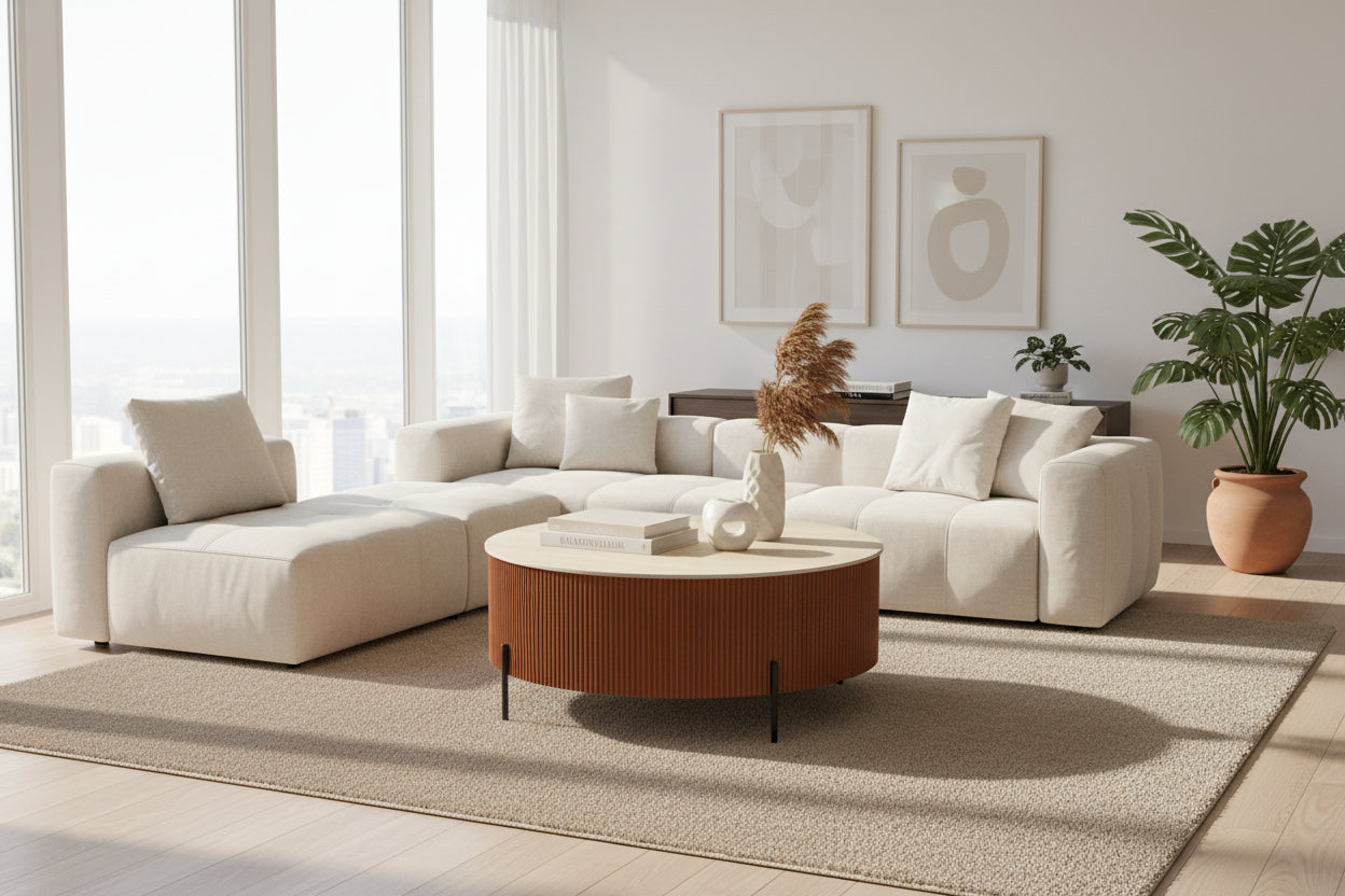 Avec son diamètre de 100 cm, cette table basse ronde structure naturellement les salons spacieux et favorise la convivialité. Son plateau en céramique effet travertin noisette apporte une touche minérale chaleureuse, facile à associer dans un intérieur contemporain ou aux inspirations naturelles. La surface est adaptée à un usage quotidien et se nettoie simplement avec un chiffon doux. Le piètement en métal noir assure stabilité et équilibre visuel tout en soulignant la forme circulaire. Placée devant un grand canapé, elle offre un espace généreux pour disposer objets décoratifs, livres ou plateaux.